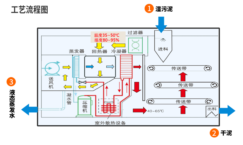 自主創(chuàng)新研發(fā)設(shè)計制造的低溫余熱污泥干化機,采用新型余熱回收設(shè)計技術(shù),充分利用煙氣、飽和蒸汽冷凝水、空